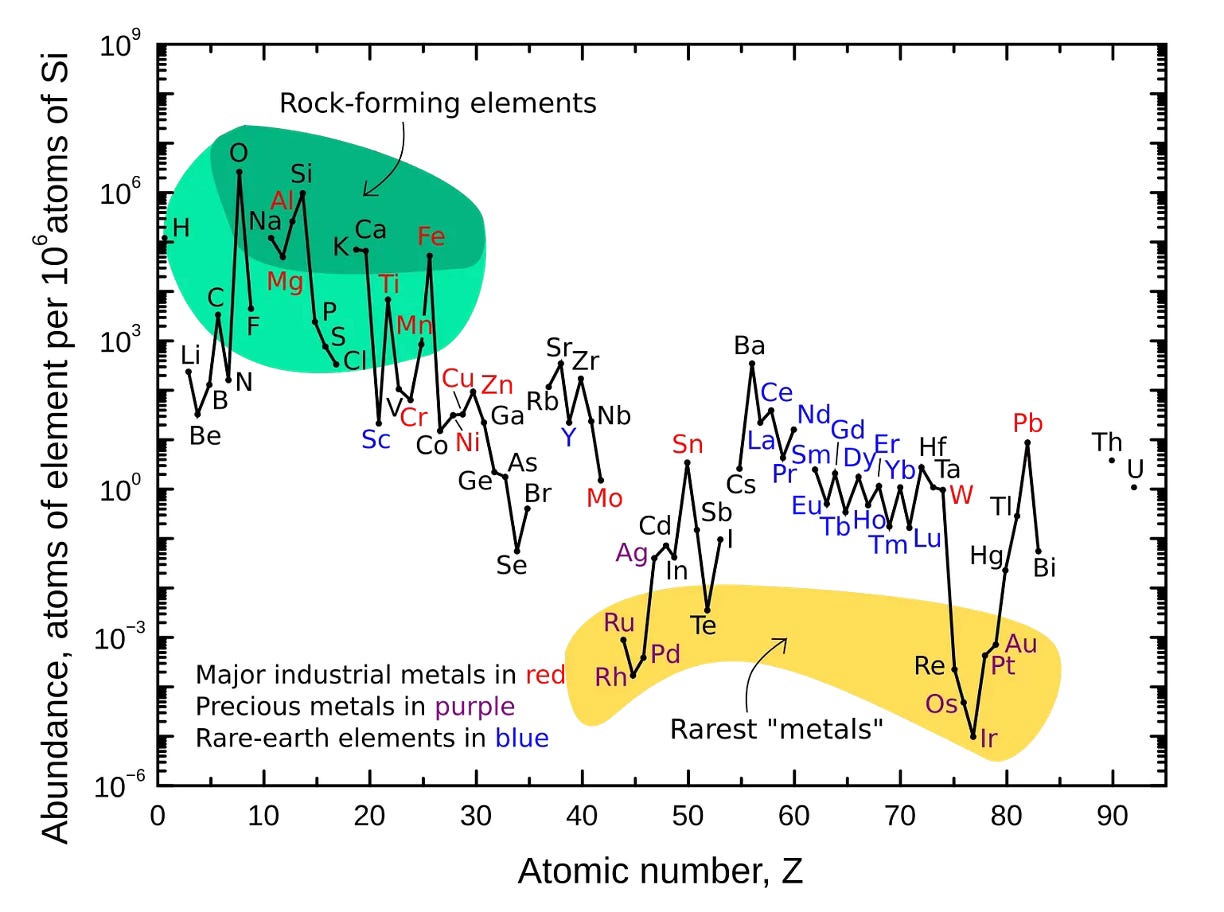(I guess it’s worth saying that we also have the oceanic crust, not just the continental crust, and that the oceans themselves, and the hydrosphere as a whole, and the atmosphere too, can all be thought of as containing a kind of elemental resource. So for completeness I’ll include these here, under the heading of Resource Number 3.)