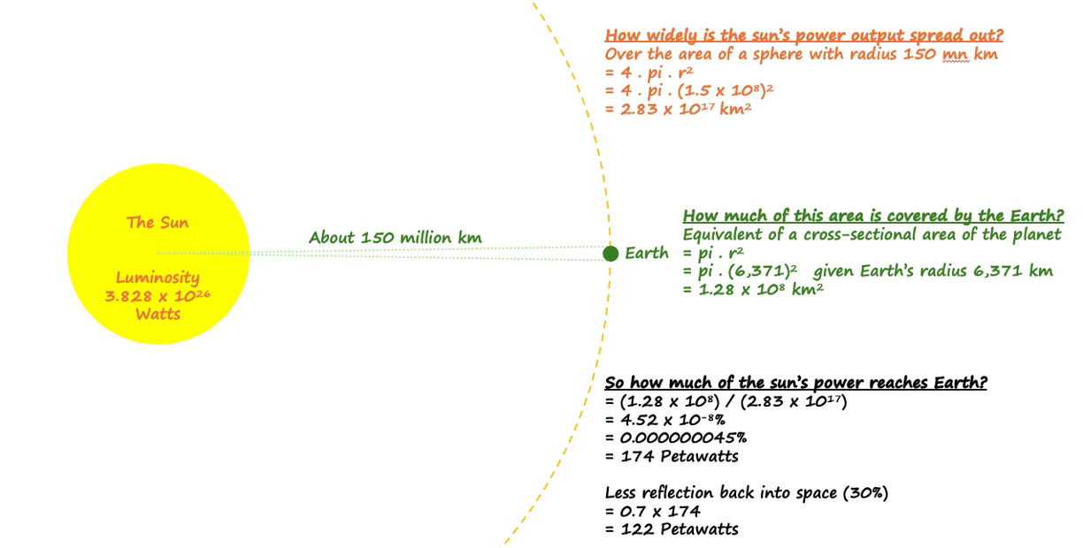Ultimately, some theorise that an advanced civilisation could one day harness 100% of the power of its local star, perhaps with a barely imaginable type of stellar containment infrastructure called a Dyson Sphere. But even with the tiny fraction of the star’s power which reaches us today, the Sun is already the source of nearly all the useful energy we can lay our hands on: it’s the source of solar power, obviously, but also, if you think about it, ultimately also the source of wind, hydro, biomass, fossil fuels and animal and human muscle power too. If you keep going back upstream to the source, it almost always starts with the Sun.
